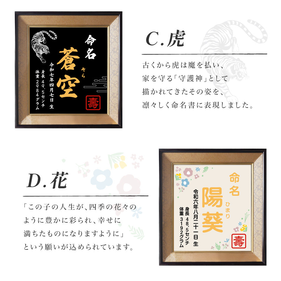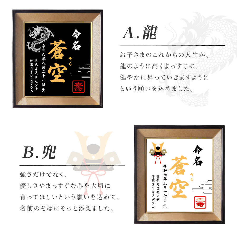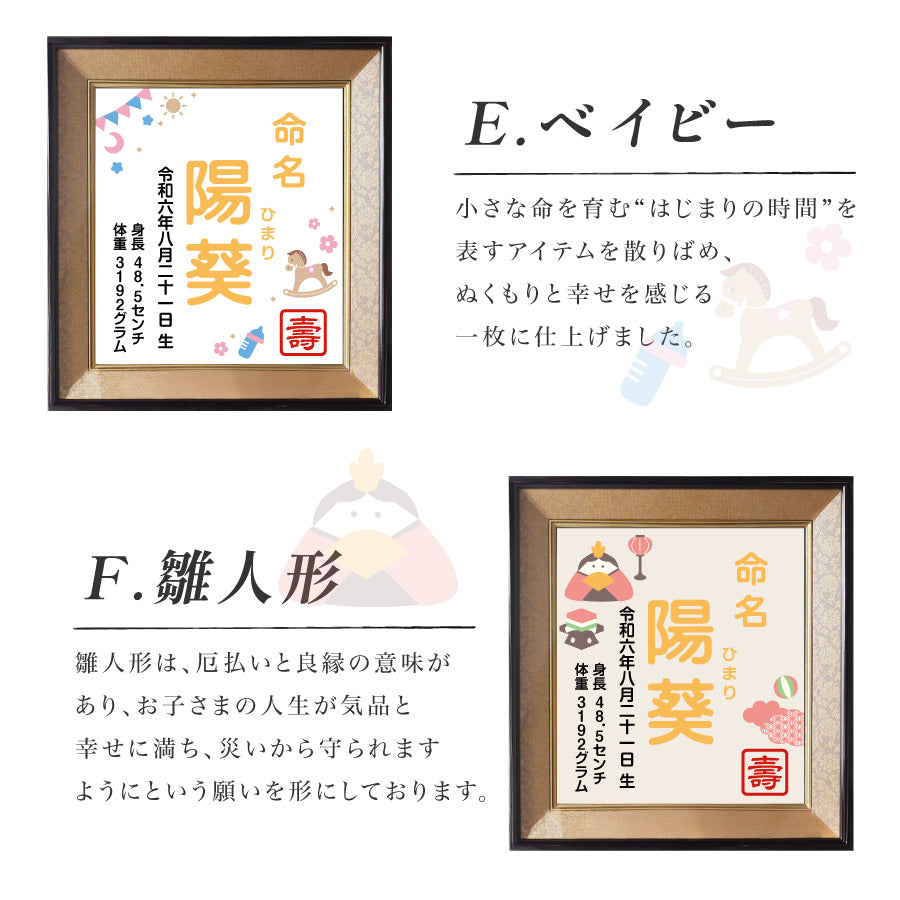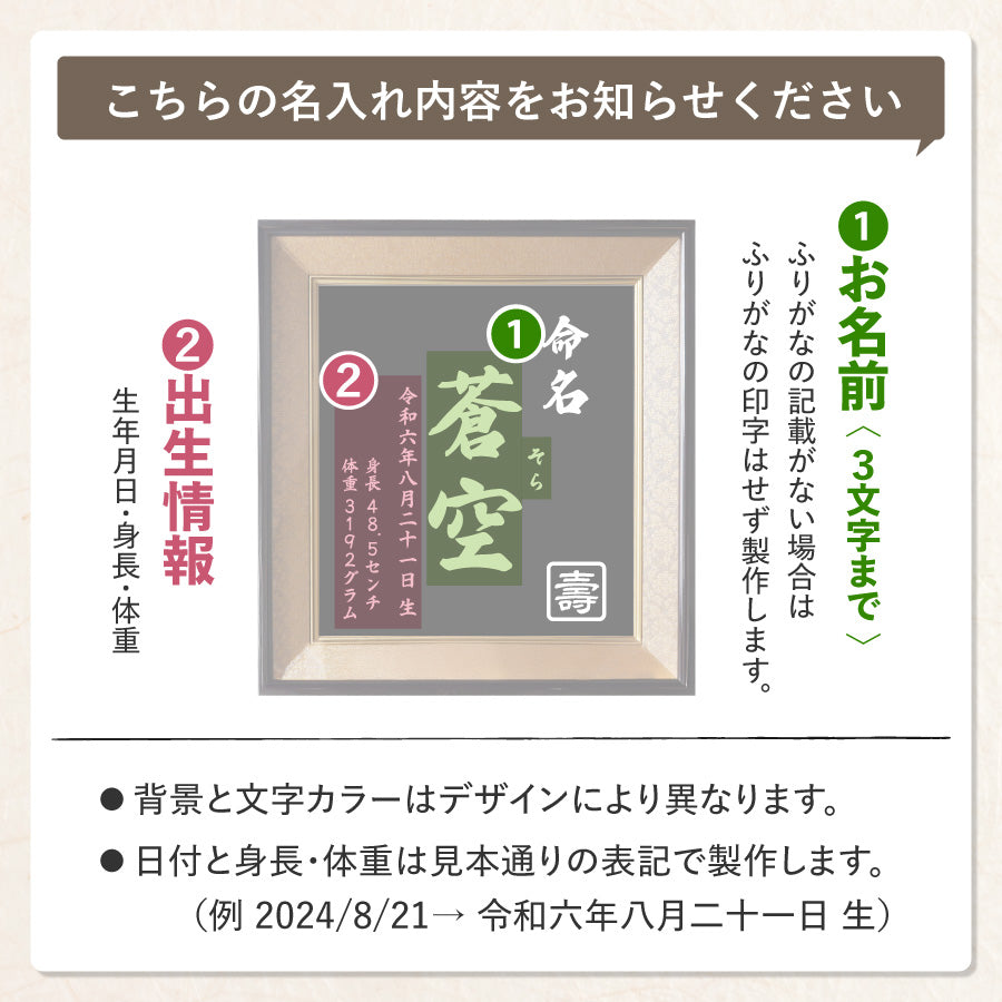 | 商品説明 | お子さまのお名前を、立体感あふれる3D刺繍で美しく表現した高級命名書 光沢のある糸で刺繍された名前と、重厚感のある額縁デザイン お部屋のインテリアとしても高級感があり、リビングや玄関に飾っても華やかに映えます。 お子さまの誕生を祝う特別なギフトとして、またはご自宅用としてもおすすめです。 こんなシーンにおすすめ ・出産祝いやお七夜の贈り物に ・おじいちゃん・おばあちゃんへの成長報告ギフトに ・誕生日・命名式の記念品に |