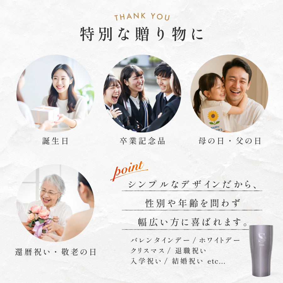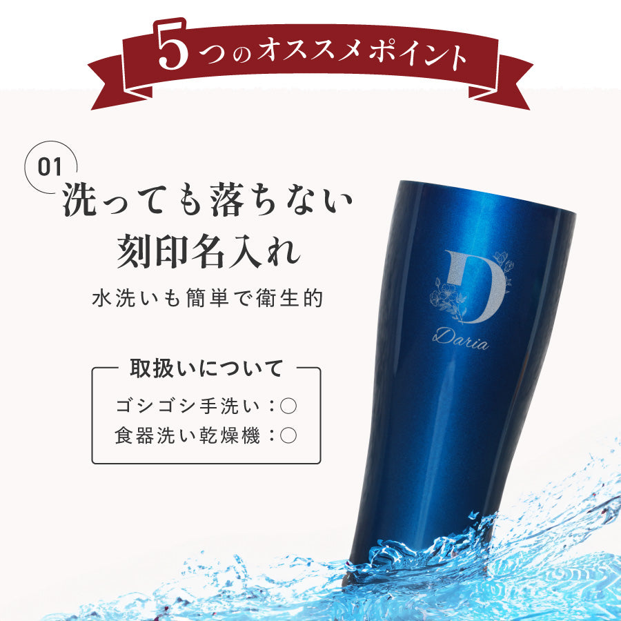 | 商品説明 | 名前を入れてつくるオシャレな名入れサーモスタンブラー。 世界にひとつだけのオリジナルが作れます。 ペアグラスとして大切な人とのお揃いのプレゼントに また、記念日の贈り物など、様々なシーンで喜ばれます! |
