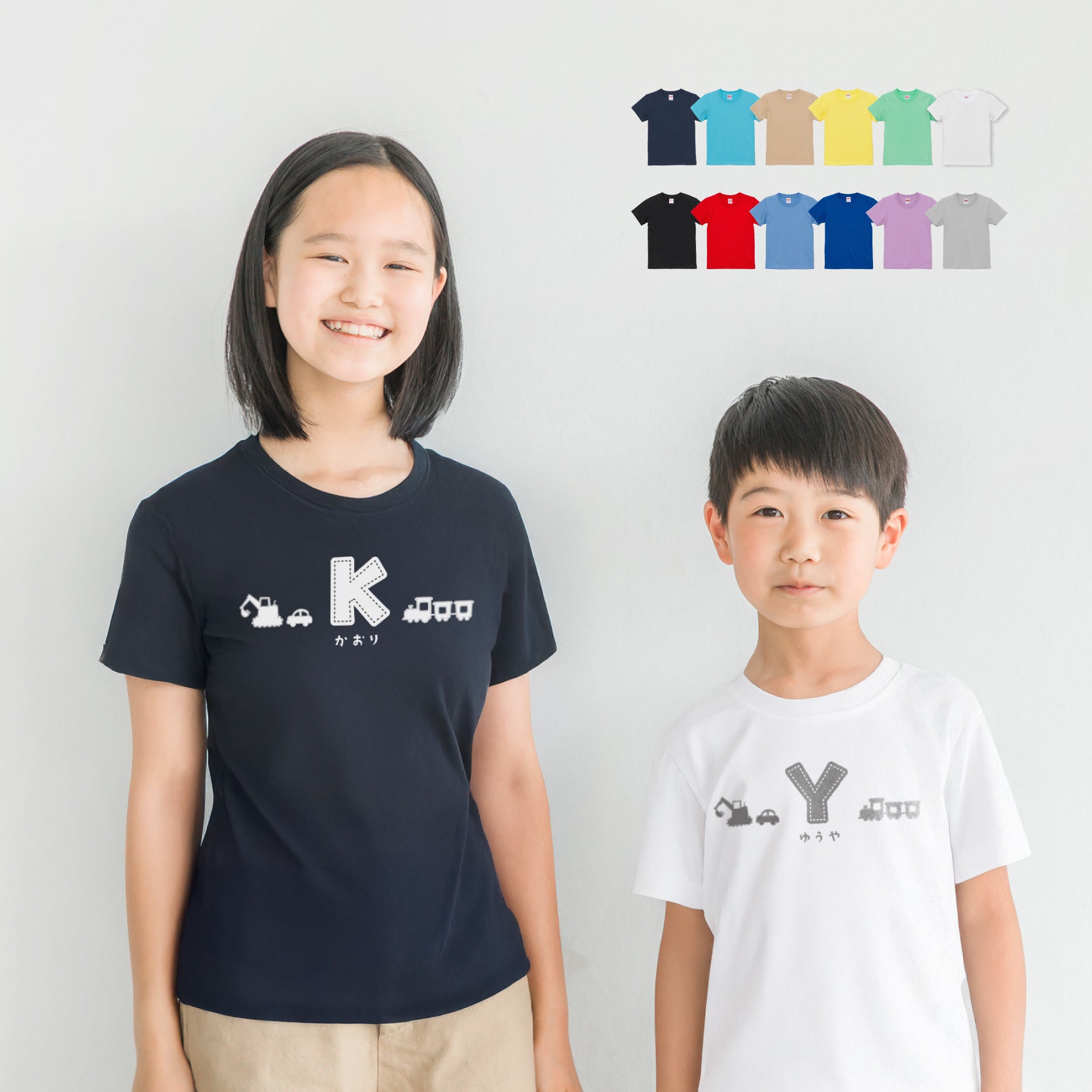 プリントTシャツ キッズ イニシャル のりもの 乗り物 名前入れ 綿100% 5.6オンス ヘビーウェイト ワンポイント シンプル オリジナル コットン オーダーメイド プリント