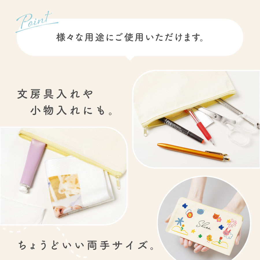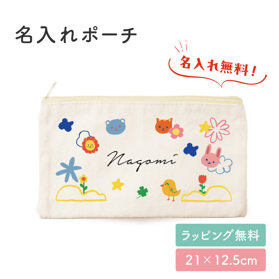 お絵かきアニマル 動物 お名前 名入れ ポーチ 小物入れ 入れ物 マチなし 文房具入れ 筆記用具 入学 お祝い おしゃれ かわいい 小さめ 大きめ ワンポイント 袋 薄い 綿 キャンバス生地