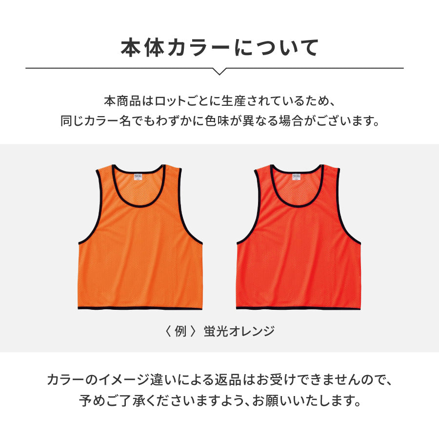 商品説明 | 【名入れ対応】メッシュビブス 両面プリント可能|6フォント・7カラー対応 スポーツやイベントにぴったり!高品質&通気性抜群の名入れメッシュビブス。 両面プリント対応だから、チーム名や個人名、背番号など自由にデザイン可能。 1枚からでもオーダーOK。短納期・高耐久で、繰り返しの洗濯にも強い! 【選ばれる理由】 チームロゴ・企業ロゴ・写真もプリントOK データを送るだけで、ロゴ入りのビブスを製作可能! 背景が透明なデータならそのまま、透明でない場合もこちらで処理いたします。 写真プリントも高画質対応!イベント映えも◎ 通気性の良いメッシュ素材 蒸れにくく快適な着心地。スポーツ時や屋外イベントでも快適に着用できます。 両面プリントOK(追加料金なし) 前面にロゴ、背面に名前や番号など、用途に合わせて両面プリントOK!10文字程度がおすすめ! 高品質なフルカラープリント 特殊なフィルム&熱圧着で、美しく色鮮やか&剥がれにくい! 柔らかく伸縮性のある素材にしっかりフィットし、着心地も快適です。 7色から選べる本体カラー ホワイト/ブラック/ブルー/レッド/蛍光イエロー/蛍光オレンジ/蛍光グリーン 用途やチームカラーに合わせてお選びください。 サイズについて 標準サイズ(L)のほか、ジュニア・大きめサイズも対応可能! ご希望の方はお気軽にお問い合わせください。 1枚から注文可能!高品質・短納期・高コスパの名入れビブス スポーツやイベントを、もっと楽しく・もっと快適に! 高品質・短納期・1枚から作れる、世界にひとつだけのビブスをお届けします! 洗濯時のご注意 ・裏返してネットに入れ、30℃以下の水温で洗ってください ・漂白剤・乾燥機・アイロンは使用しないでください ・長持ちさせるためにも、やさしくお手入れをお願いします |