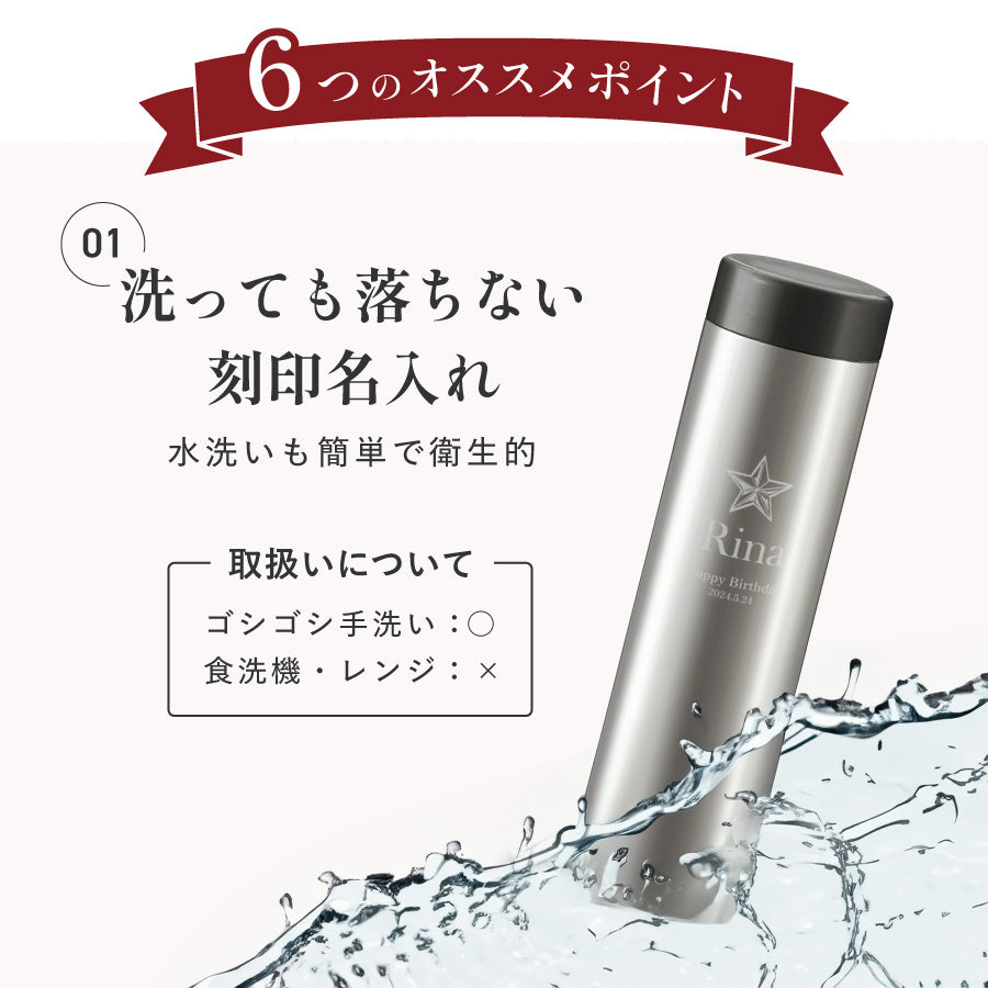 「贈り物に特別なひとときを。名入れ対応・使いやすいドリンクボトル」 ギフトラッピングとメッセージカードを無料で対応しております! シンプルで洗練されたデザインはどんなシーンにもマッチします。 スリムな作りで持ち運びやすいのも魅力です。 さらに名入れ対応も可能。大切な方のお名前やメッセージを名入れすれば、記念日や誕生日の特別なギフトとしてぴったりです。高級感ある仕上がりで、夫婦や恋人、家族や友人へのプレゼントにも喜ばれます。