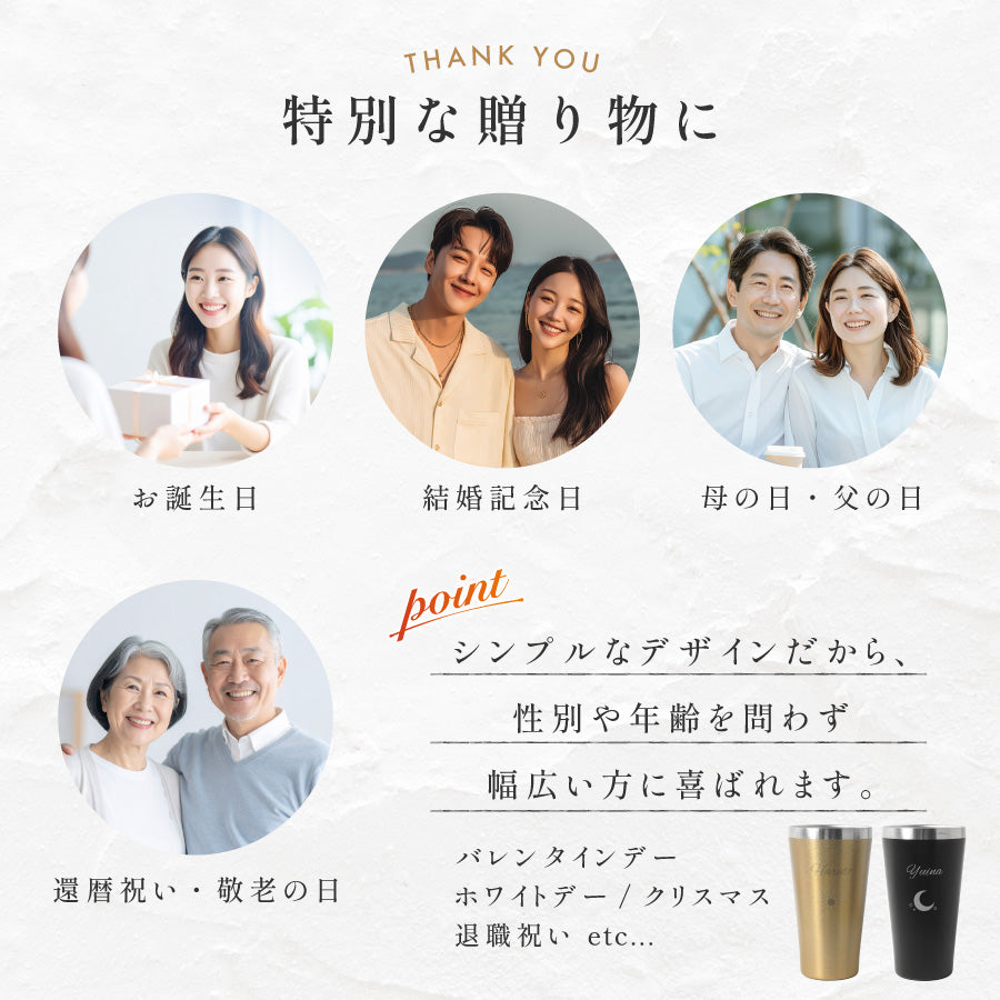 毎日の晩酌が、もっと特別な時間に。 【特別な贈り物に】 【シンプルデザインで誰にでも】 【4つのおすすめポイント】 【おすすめの贈り先・用途】 関連キーワード:名入れ タンブラー ステンレス 保冷 保温 ペア ギフト 名前入り プレゼント 記念日 誕生日 母の日 父の日 敬老の日 退職祝い オリジナル 刻印 おしゃれ 高級 ギフトボックス付き |