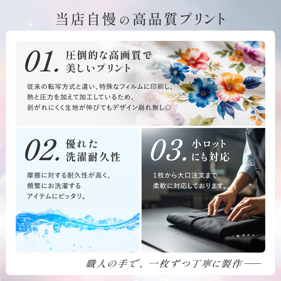 1枚からのオーダーもOK、自社工房で丁寧にプリントいたします。